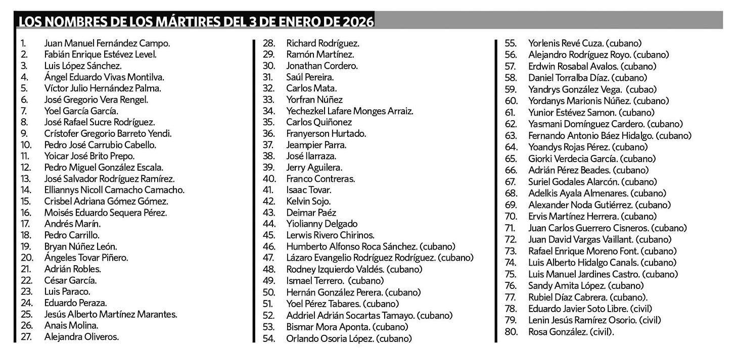 A propósito de la agresión gringa contra nuestro país, como ya sabes, fue inaugurado un monumento en homenaje a los mártires asesinados el 3 de enero. Allí están las placas con los nombres de los caídos, venezolanos y cubanos, militares y civiles. Esta es la lista de los 80: