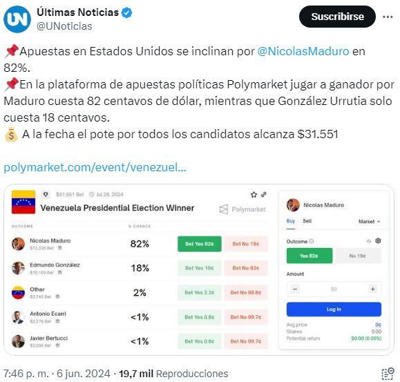 Polymarket es un mercado de predicciones de #EEUU que funciona en Blockchain. La gente apuesta sobre la probabilidad de que un evento termine en un determinado resultado. El share o acción de un resultado posible es más caro si más gente apuesta por esa probabilidad. Las apuestas sobre el resultado electoral del #28J en Venezuela están 4 a 1 a favor de Nicolás Maduro, lo que quiere decir que 4 de cada 5 participantes confían su dinero a que Maduro ganará la elección, o también que 8 de cada 10 están tan convencidos de que Maduro ganará que invierten dinero en esa posibilidad.