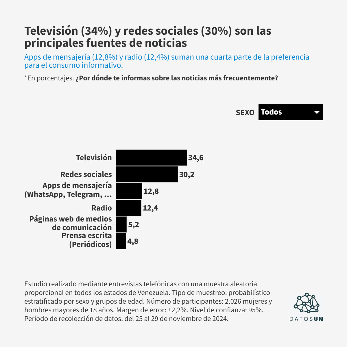Te invito a leer la nota con los resultados de la encuesta sobre consumo de noticias en Venezuela que realizamos en DatosUN, la unidad de investigación y análisis de datos del Grupo Últimas Noticias. Encontramos que las plataformas digitales han desplazado a la mayoría de los medios tradicionales a la hora de suministrar contenido informativo, excepto el caso de la televisión. La encuesta nacional arrojó que 34% se informa por TV y 30% lo hace por redes sociales. Además, las redes sociales con mayor poder informativo son Instagram (25%), Facebook (21%) y TikTok (19%). Lee aquí la nota con muchos más datos y gráficos interactivos, donde puedes filtrar los resultados por sexo y edad.