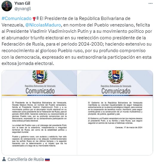 El presidente Nicolás Maduro felicitó a Putin por su triunfo. “Putin le ha ganado completo la guerra al imperio colectivo de occidente”, dijo.