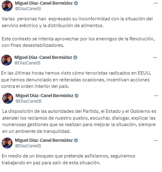 Ayer hubo manifestaciones en Santiago de Cuba y Bayamo por la situación del servicio de electricidad y al distribución de alimentos. La cosa es que medios y gente de las redes sociales agarraron las imágenes e inflaron la cosa para hacer creer que se trataba de una suerte de “protesta generalizada” contra el gobierno cubano, como ha pasado antes cuando ha habido eventos similares. Hubo manipulación y por eso el tema se volvió tendencia. El propio presidente de Cuba, Miguel Díaz-Canel, publicó el siguiente mensaje en X: