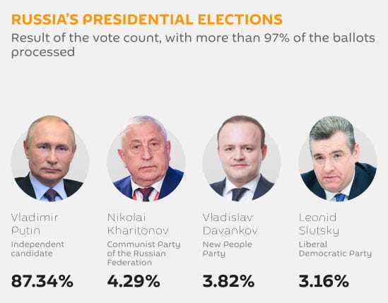 En Rusia hubo una elección presidencial de tres días que culminó anoche con la victoria aplastante de Vladimir Putin, quien será el presidente ruso por otros seis años. La votación comenzó el viernes en las regiones más orientales del país y finalizó ayer en el oeste, eso es porque en los 9.000 kilómetros que hay de una punta a la otra de ese país se ubican 11 husos horarios. Pero el punto es que Putin sacó 87,34% y el que le llegó de segundo, el candidato del Partido Comunista, sacó 4,29%. Hubo una participación de más del 74% del registro electoral.