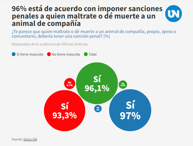 Antes de que te vayas a ocuparte de tus cosas, te recomiendo leer la nota con los resultados de nuestra encuesta digital de la semana pasada. Resulta que prácticamente todo el mundo (96%) está de acuerdo con que el maltrato animal, incluyendo el asesinato de mascotas, sea penado con cárcel. La gente apoya las propuestas hechas por el Ministerio Público en el marco del debate de la Ley para el Trato Digno y Responsable de los Animales de Compañía, que fue aprobada en primera discusión en la Asamblea Nacional y está en plena consulta pública. La encuesta también dice que por lo menos cuatro de cada 10 personas ha presenciado un hecho de maltrato contra animales de compañía. también llega a 96% la aprobación de la idea de que los animales de compañía sean reconocidos como seres con derechos. Hay muchos más datos, presentados con gráficos interactivos. Lee la nota aquí y cuéntame qué te pareció.