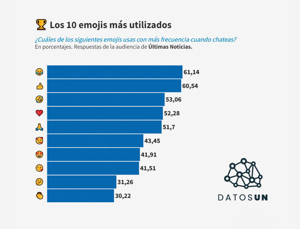 Tú sabes que la encuesta de Datos UN de la semana pasada fue sobre el uso de emojis 😝 y yo sé que te interesan mucho los resultados. Si no los viste ya, pues están publicados en Últimas Noticias desde el fin de semana, aquí te los dejo para que descubras datos como los 10 emojis más utilizados, qué tanto los utilizamos, cuáles pueden tener según la edad. Lee la nota con gráficos interactivos, analiza los datos y cuéntame qué te parece.