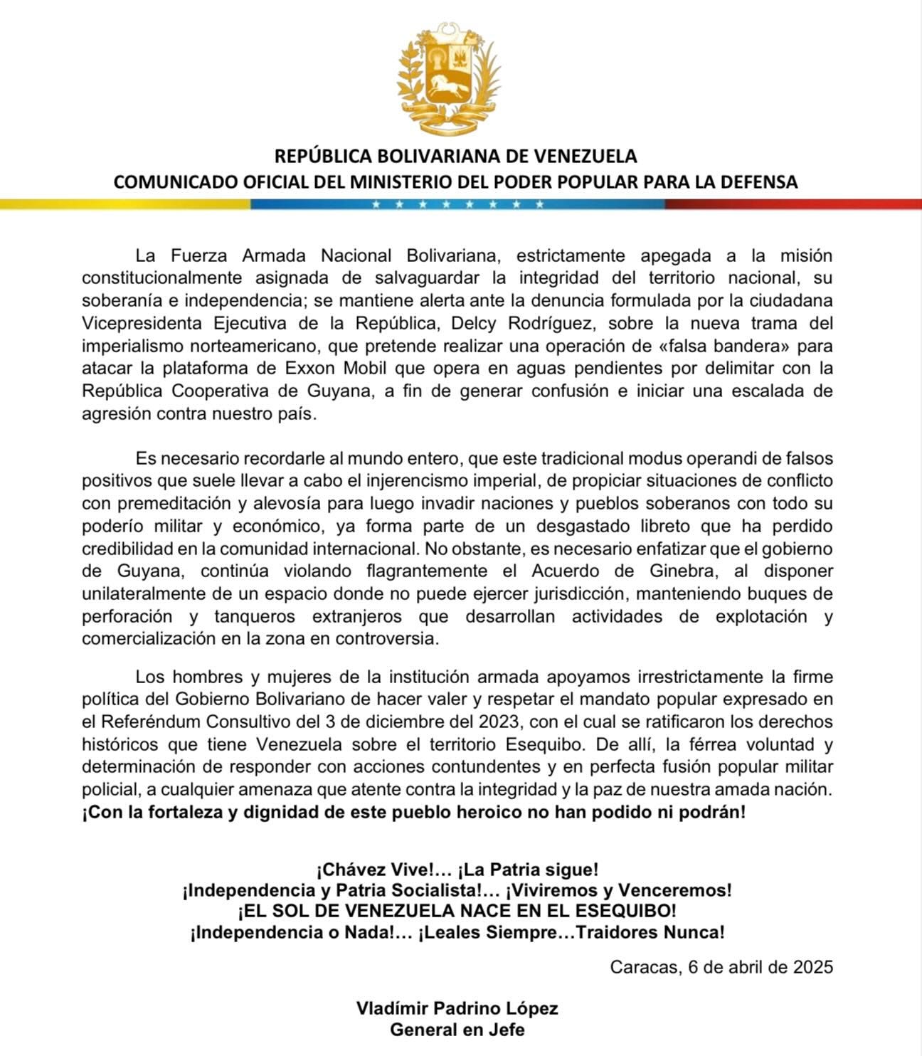 El ministro de la Defensa, Vladimir Padrino, publicó ayer un comunicado reaccionado a esta noticia. Dice que la FANB se mantiene alerta y lista para responder ante cualquier amenaza.