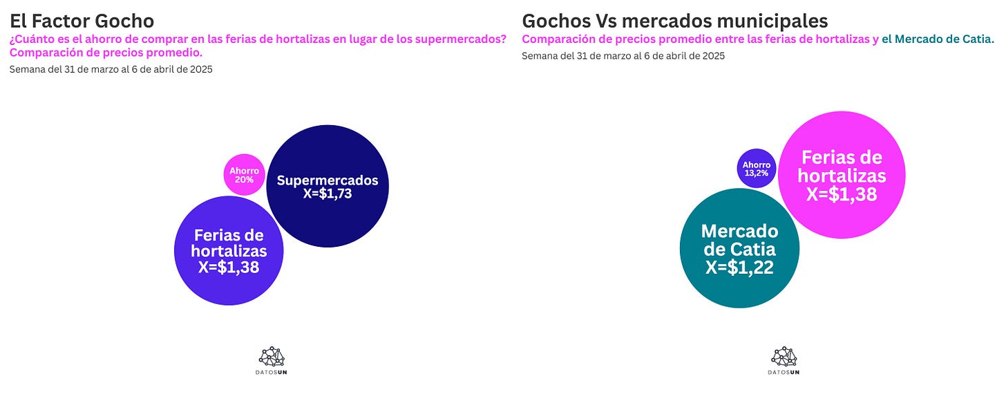Hablando de ahorro, aquí tienes el Factor Gocho de esta semana. Calculamos cuánto te ahorraste entre el 31 de marzo y el 6 de abril si compraste hortalizas en las ferias de los gochos en vez de en supermercados. La cifra esta semana fue 20%. También comparamos los precios de los gochos con el Mercado de Catia, que sale ganando, pues estuvo 13,2% más barato todavía.