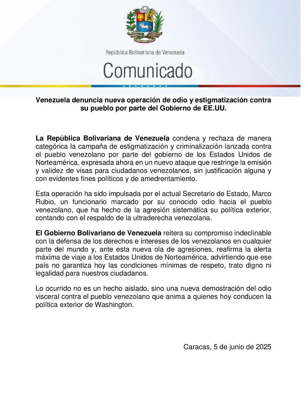 El Gobierno respondió formalmente al decreto de Trump que suspende las visas para los venezolanos. Déjame decirte que el comunicado de la cancillería es bien claro y preciso. Dice, en resumen, que esto de lo que se trata es de una nueva campaña de estigmatización de Venezuela y los venezolanos empujada por alguien con nombre y apellido: Marco Rubio, “un personaje marcado por su conocido odio por el pueblo venezolano”. Aquí te lo dejo para que lo leas.