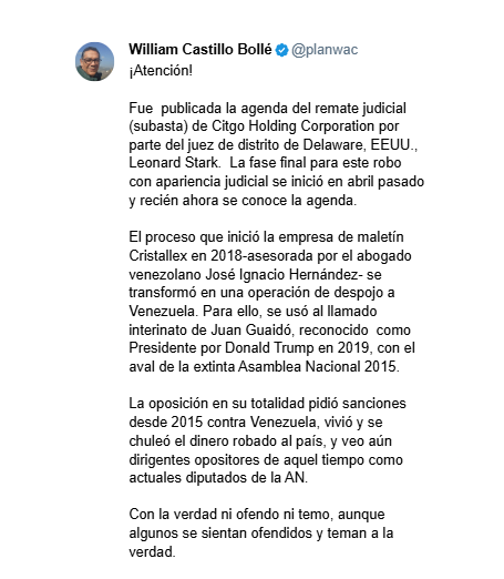 Otra cosa que tienes que saber es que se terminaron de robar Citgo. William Castillo lo señaló ayer en redes, publicaron la agenda de la subasta con la que van a rematar esa empresa que le pertenece al Estado venezolano.