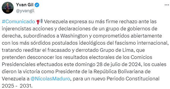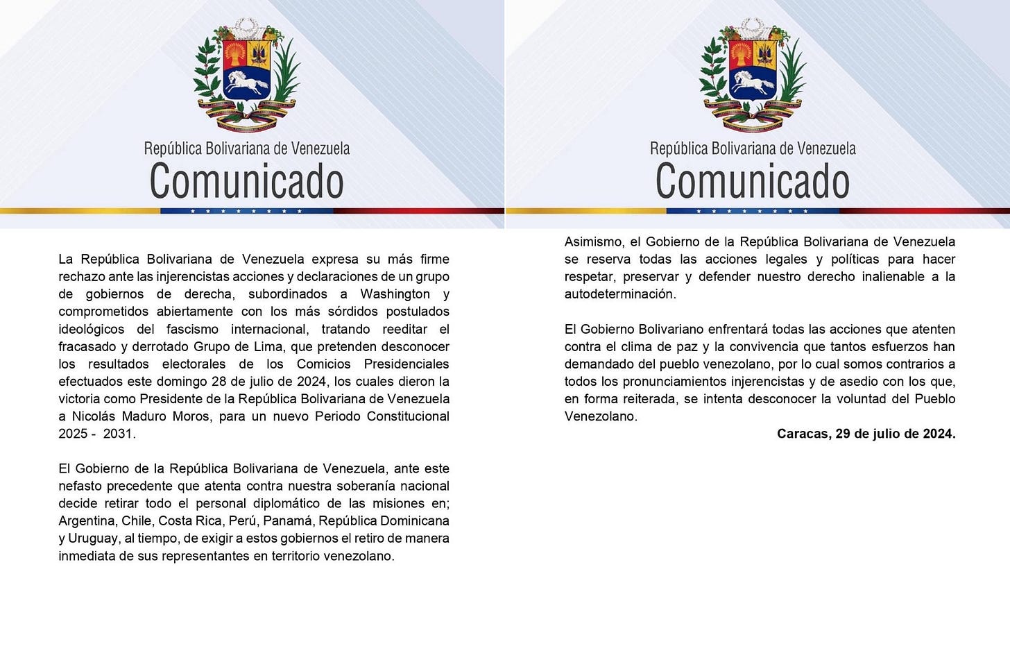 Muchos países han reconocido la vitoria del presidente Nicolás Maduro, entre ellos China, Rusia, Irán, Bolivia, Cuba, Nicaragua, Honduras, Guinea-Bissau y Serbia. Sin embargo, un grupo de gobiernos de América Latina publicaron un comunicado en el que desconocen el resultado electoral, cuadrándose con el discurso de la oposición extremista de aquí. Por eso el Gobierno decidió retirar a todo el personal diplomático de estos países: Argentina, Chile, Costa Rica, Perú, Panamá, República Dominicana y Uruguay.