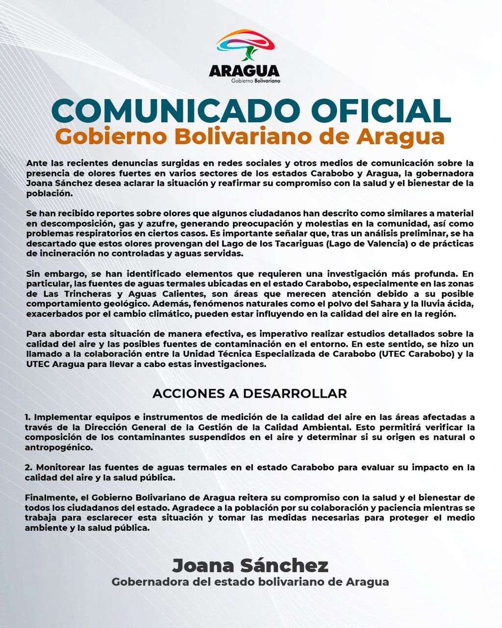 La gobernadora de Aragua, Joana Sánchez, informó que arrancará una investigación profunda sobre un fenómeno que se reportó desde el fin de semana en varias ciudades tanto de Aragua como de Carabobo: un intenso olor descrito por los ciudadanos como “similar a material en descomposición, gas y azufre”. Esto ha generado mucho malestar en la población y por eso se tomarán medidas. Lo primero es la investigación tanto de la fuente de los malos olores como sobre la calidad del aire en la región. Lee aquí el comunicado.
