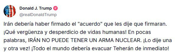 Tal vez esta situación fue lo que hizo que Trump saliera a amenazar a Irán directamente por redes sociales. Publicó un mensaje que da a entender que EEUU podría tomar alguna acción contra los iraníes. Al decir que “todo el mundo debería evacuar Teherán de inmediato” trata de aterrorizar a la población por cuenta de un posble ataque más intenso de lo que se ha dado hasta ahora.