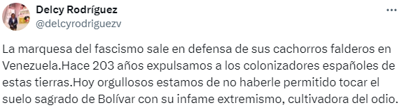 Ayer destacó también la respuesta que la vicepresidenta Delcy Rodríguez le dio en la red social X a la política y aristócrata española Cayetana Álvarez, quien se dedicó a atacar a Rodríguez por esa vía. Álvarez, congresista del derechista Partido Popular, durante años ha hecho del “tema Venezuela” parte central de su discurso político. Delcy la atajó y le dijo que por más que insistan “nunca pondrán sus dedos sobre la digna Venezuela”.