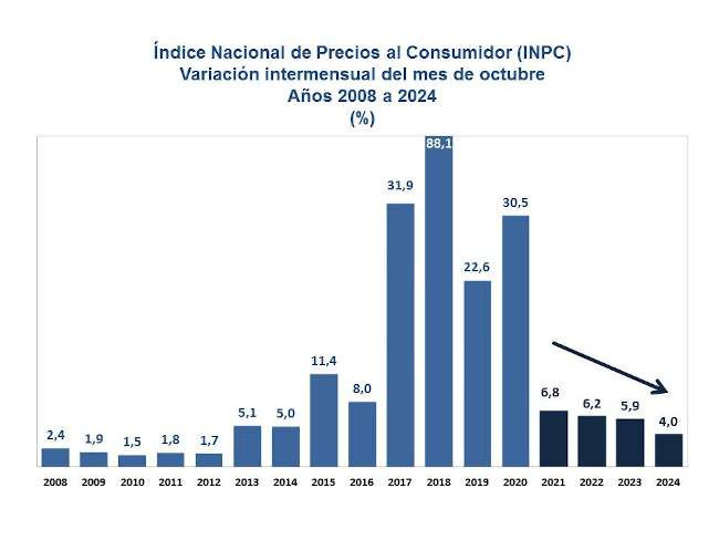 El Banco Central de Venezuela publicó el viernes el dato de la inflación del mes de octubre, que fue de 4%. La nota que publicaron destacó que la cifra es menor con respecto a octubre de 2023 (5,9%) y la más baja para un mes de octubre desde 2012 (1,7%).