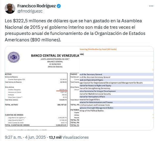 El economista opositor Francisco Rodríguez publicó en redes sociales algunas cuentas de la plata que se robó Juan Guaidó y su pandilla con el cuento del “gobierno interino”. Rodríguez hace una comparación y muestra que, nada más en los “gastos” de la llamada “Asamblea Nacional de 2015” y el “gobienro interino” se bajaron más de 322 millones de dólares, lo cual es “más de tres veces el presupuesto anual de la OEA”.
