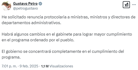 Después del escándalo de la transmisión en vivo del consejo de ministros, el presidente de Colombia Gustavo Petro tomó la decisión de pedirle la renuncia a todo el gabinete ministerial y directores de departamentos.