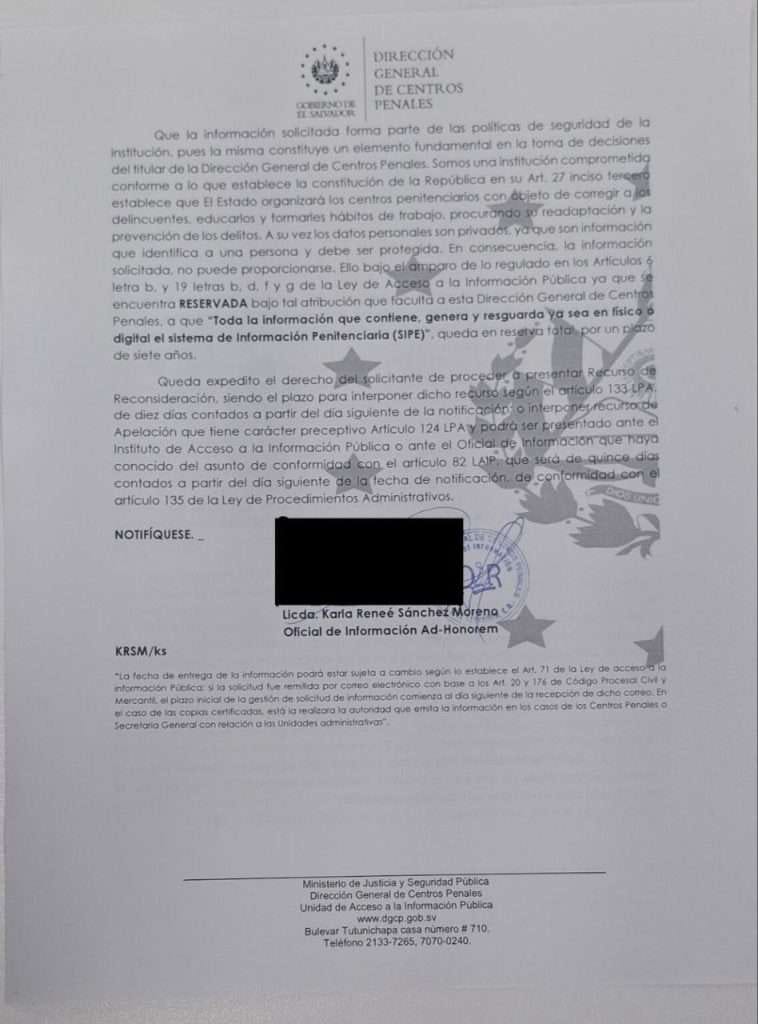 Es noticia que el gobienro de El Salvador declaró que toda la información sobre los venezolanos secuestrados en la cárcel de Bukele está bajo estatus “reservado”. Esto se hizo evidente cuando un medio de comunicación solicitó formalmente a la Dirección General de Centros Penales de El Salvador copia del acuerdo suscrito entre ese país y EEUU o cualquier otro documento oficial que acredite la existencia de coordinación o cooperación con respecto al tema penitenciario. La respuesta de la instancia en cuestión fue que esa información es “reservada” bajo la ley que dice que todo lo relacionado con el sistema penitenciario “queda en reserva total por un plazo de siete años”.