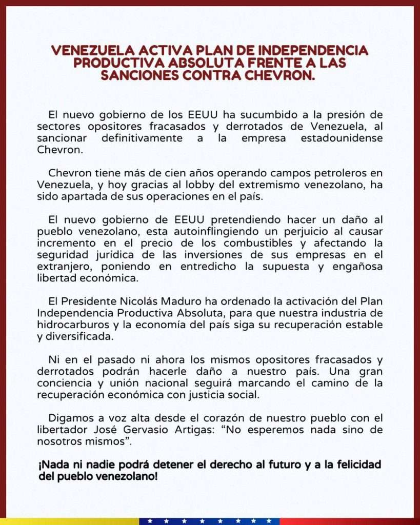 Venezuela no se queda de brazos cruzados. Ayer la vicepresidenta Delcy Rodríguez publicó un comunicado que anuncia la activación del Plan Independencia Productiva Absoluta, “para que nuestra industria de hidrocarburos y la economía del país siga su recuperación estable y diversificada”.