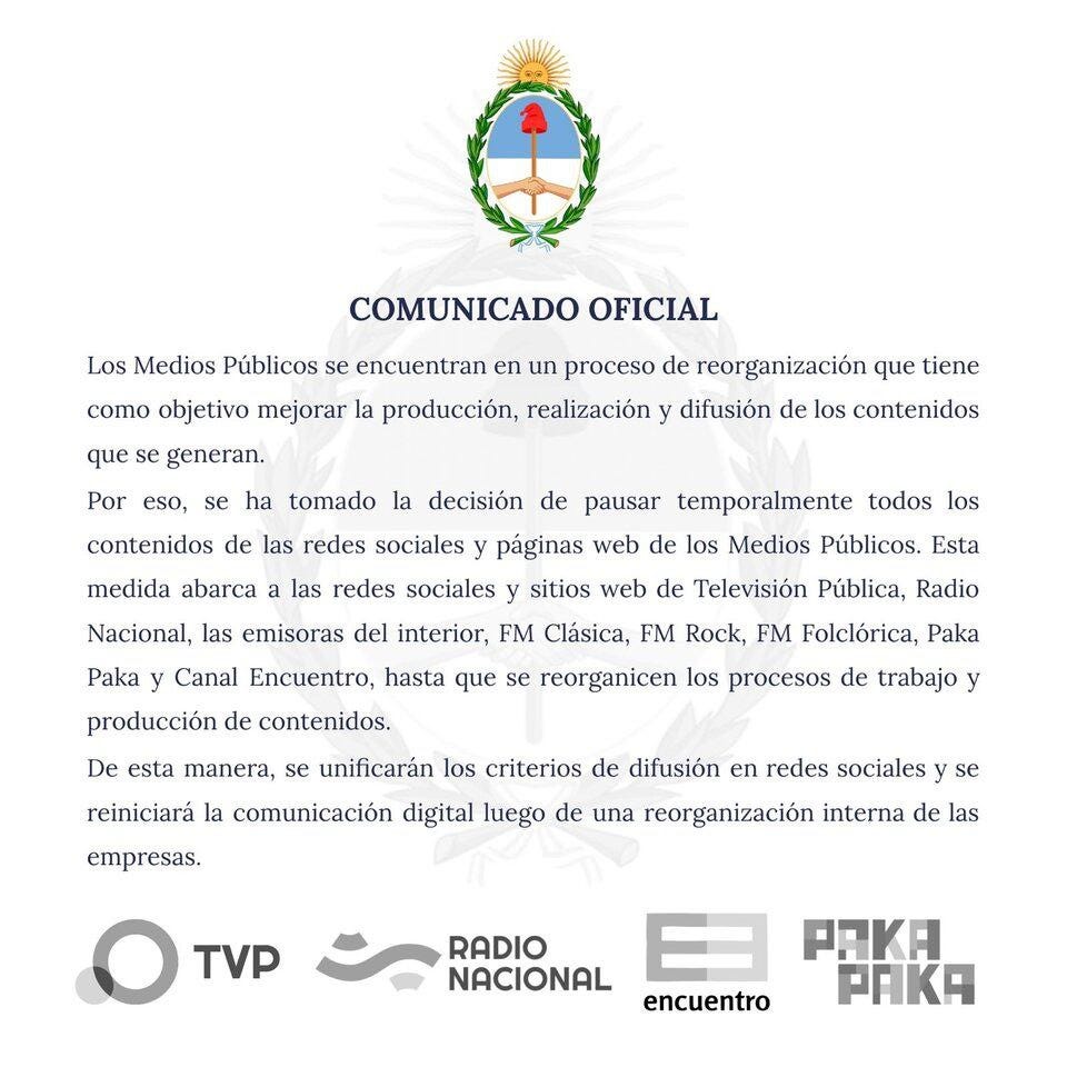 Es noticia que Javier Milei paró en seco el funcionamiento de los medios públicos en su versión digital. El comunicado oficial dice que la razón es que habrá un proceso de reorganización para mejorar la producción. Esto ha sido muy criticado en Argentina, Milei es extravagante con su discurso sobre la “libertad”, pero al mismo tiempo cierra medios de comunicación.