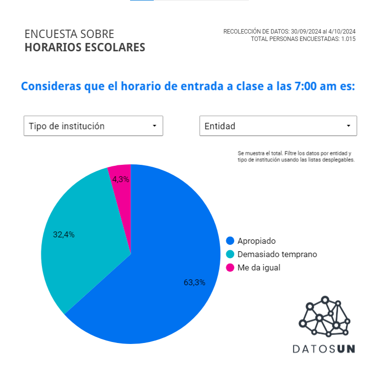 Arrancó el año escolar y en Datos UN consultamos a los hogares con chamos en escuela o liceo cómo es la dinámica con los horarios. La mayoría entra a clase a las 7 am. algunos consideran que esto es muy temprano, pero esta opinión corresponde a 32,4% de los casos. Una mayoría de 63,3% dijo que le parece apropiado ese horario. También obtuvimos otros datos interesantes, como que en la mitad de los casos es la mamá del niño o niña quien lo lleva al colegio, los papás asumen esta tarea solo en 10% de los casos. Lee la nota completa con gráficos interactivos aquí. Puedes filtrar la información por estado de Venezuela y también ver las cifras de instituciones públicas o privadas.