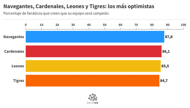 La otra noticia es que hoy comienza la temporada de beisbol, que en Venezuela es muy importante porque la gente expresa su identidad beisbolera y se vive la emoción del deporte en todos lados. En DatosUN hicimos una encuesta y recogimos los pronósticos de los fanáticos. Con más de dos mil respuestas, obtuvimos que las fanaticadas más optimistas, las que confían en que su equipo quedará campeón, son Magallanes (87,8%), Lara (86,1%), Caracas (85,5%) y Aragua (84,7%). Chequea este y otros datos aquí.