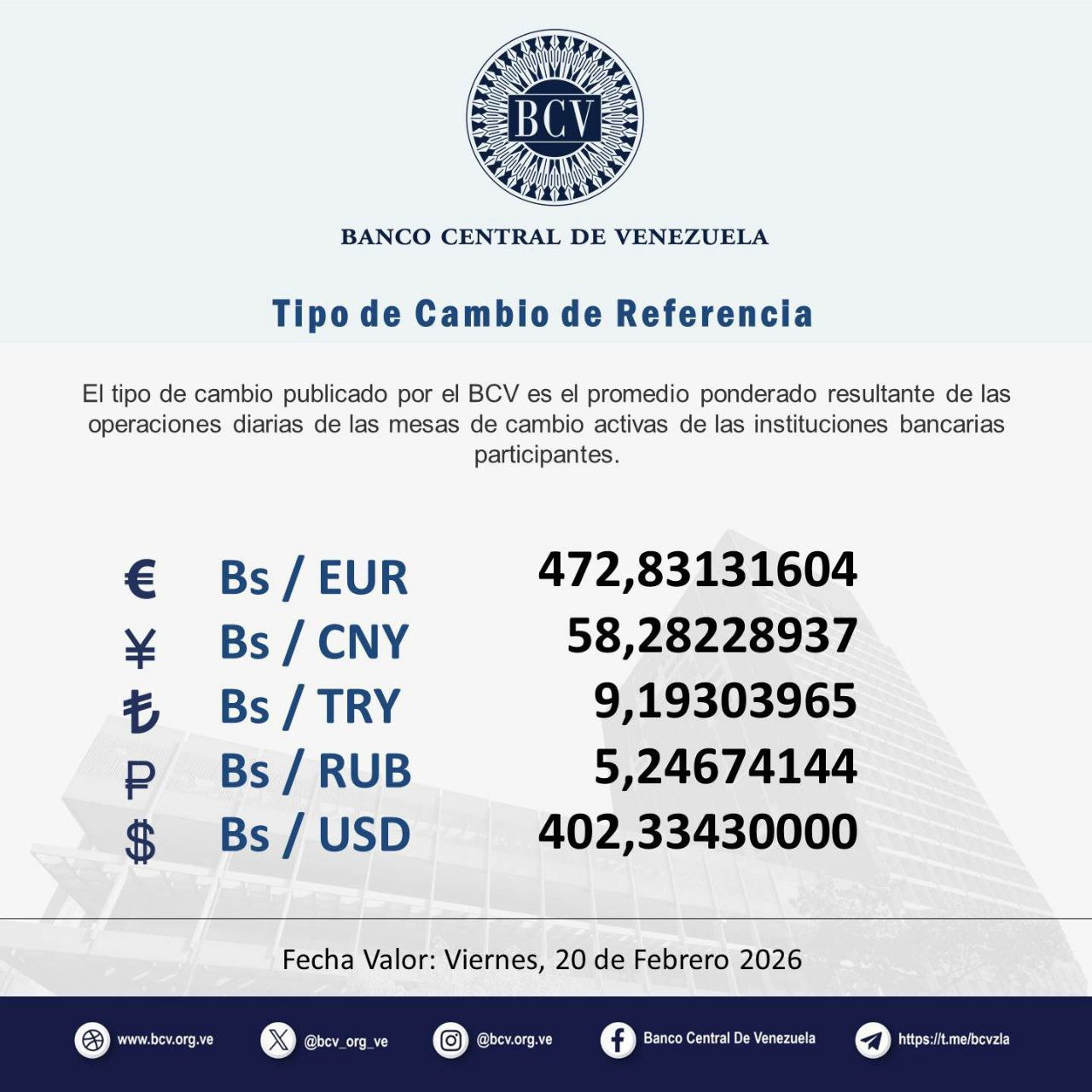 El Banco Central de Venezuela informó que las mesas de cambio de ayer arrojaron un promedio de 402,3343 bolívares por dólar. Recuerda que esta es la única tasa válida para cualquier transacción del día de hoy.