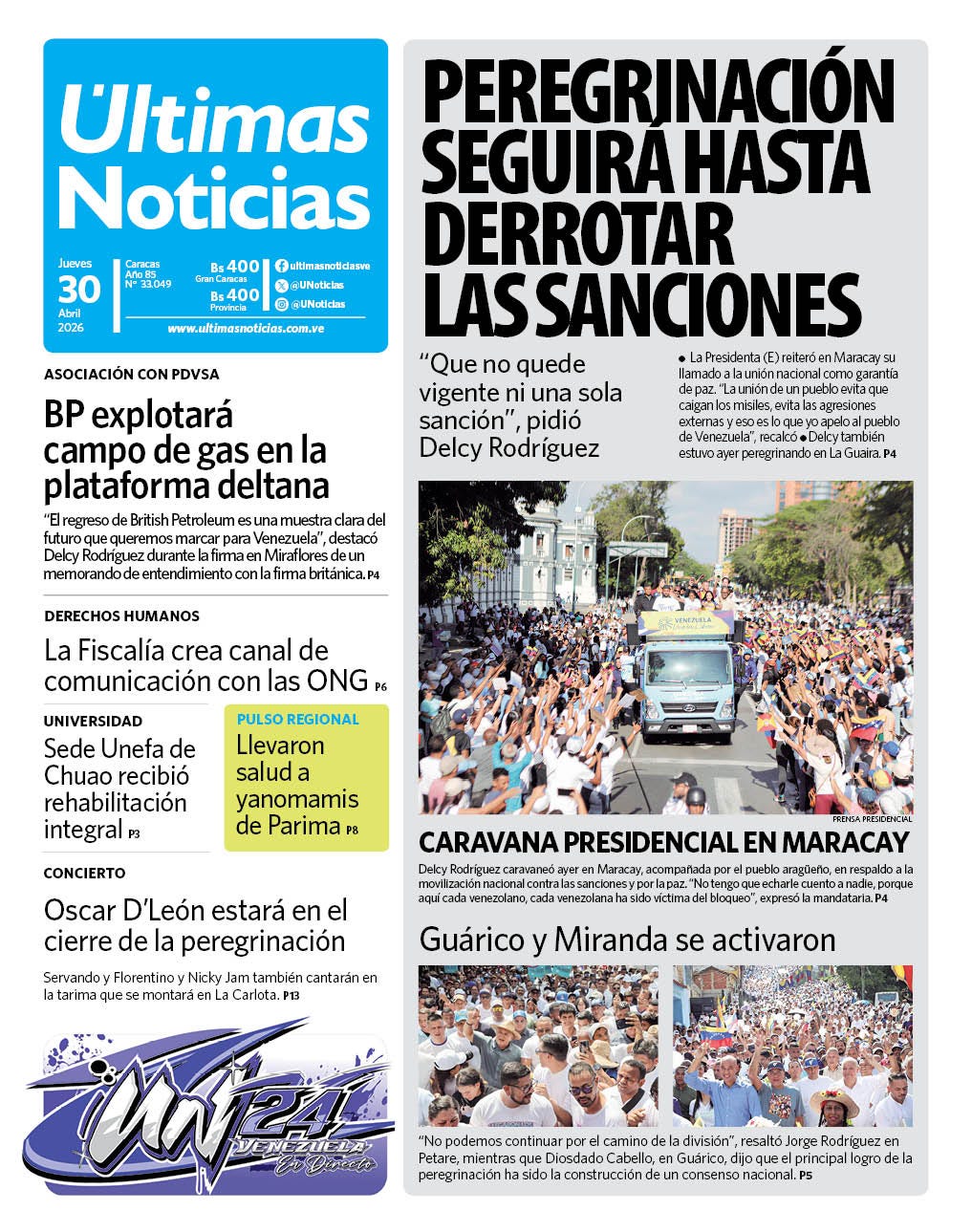 La presidenta encargada Delcy Rodríguez encabezó la peregrinación por el fin de las sanciones ayer en Aragua y La Guaira. Hoy deben llegar a Caracas las tres columnas que han recorrido todo el país para una gran concentración. Pero la cosa no terminará hoy, anunció Delcy, sino que la peregrinación continuará hasta que no quede ni una sola sanción sobre Venezuela.