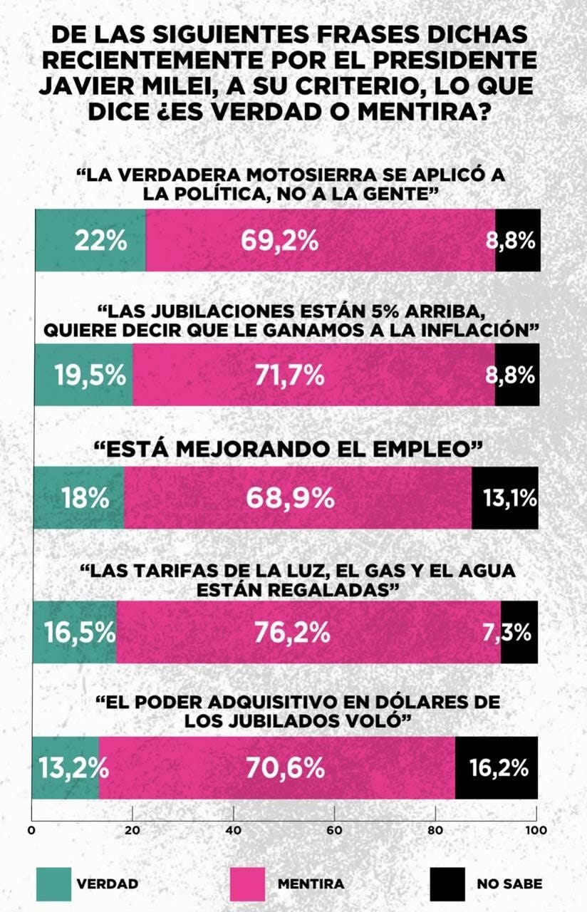 Javier Milei tiene solamente nueve meses en el gobierno y ya los argentinos lo detestan. Una encuesta hecha en estos días muestra que la mayoría, alrededor de 7 de cada 10 en todos los casos, no le cree nada de lo que dice. Claro está que no es difícil que sea así , ya que este señor, muy en la onda de sus amigos Trump y Elon Musk, se la pasan lanzando mentiras todo el día por todos lados. En la encuestase pidió valorar varias frases de Milei y salió raspado, no le creen. Además, se midió la evaluación de su gestión y casi 60% lo desaprobó.