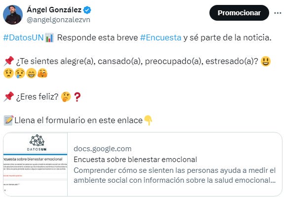 Hablando de encuestas, no dejes de contestar la encuesta digital de DatosUN de esta semana. Comprender cómo se sienten las personas ayuda a medir el ambiente social con información sobre la salud emocional de la sociedad que los indicadores económicos tradicionales no captan. Esta encuesta pretende explorar algunos aspectos ilustrativos en este sentido. Llena el formulario aquí y compártelo.