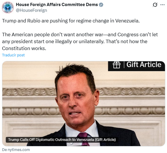 Es noticia que el grupo de congresistas demócratas del Comité de Asuntos Exteriores de la Cámara de Representantes gringa se pronunciaron directamente en contra de la guerra que quieren imponer Trump y Marco Rubio.