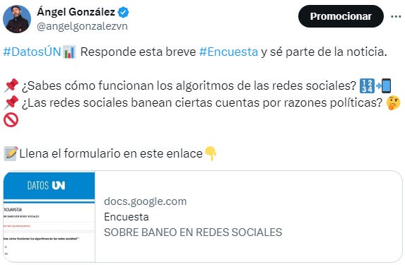 No te me retires sin participar en la encuesta de Datos ÚN de esta semana. Esta vez queremos medir qué tanto conocimiento tiene la gente de eso que llaman el “baneo” en redes sociales. ¿Tienes alguna idea de cómo funcionan los algoritmos de las redes? ¿Te parece que las empresas de redes sociales manipulan los sistemas según sus intereses? ¡Opina! Llena el cuestionario que encontrarás en este enlace y busca los resultados el fin de semana en ultimasnoticias.com.ve.