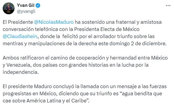 Hablando del triunfo de la izquierda en México, el presidente Maduro conversó por teléfono con Claudia Sheinbaum, la flamante presidenta electa. El canciller Yván Gil informó sobre la llamada y dijo que ambos ratificaron el compromiso con las relaciones de amistad y cooperación entre ambos países.