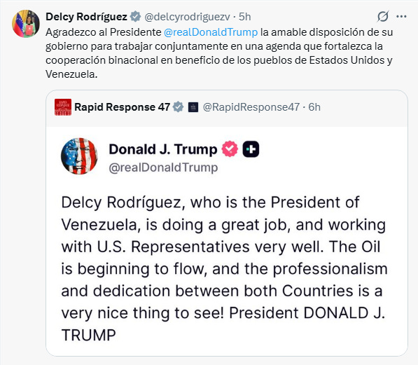 “Delcy Rodríguez, quien es la presidenta de Venezuela, está haciendo un excelente trabajo y colaborando muy bien con los representantes estadounidenses. El petróleo está empezando a fluir y el profesionalismo y la dedicación entre ambos países son algo muy grato de ver”.