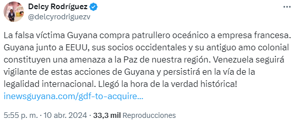 Hablando de la vicepresidenta Rodríguez, ayer lanzó una importante alerta a través de la red social X sobre los últimos pasos del gobierno de Guyana. Aquí te lo dejo: