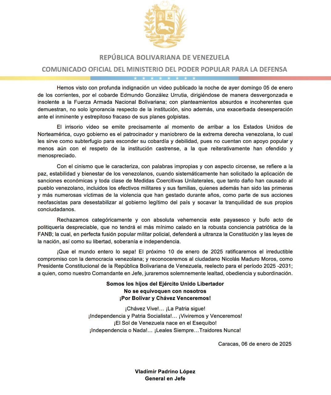 Con estas palabras se refirió el ministro de la Defensa, general Vladimir Padrino, a Edmundo González por el video que publicó en redes sociales el domingo incitando a los militares a sublevarse contra el Gobierno. Fue claro cuando dijo que lo que hace la oposición extremista con esto es llamar a una guerra entre venezolanos.