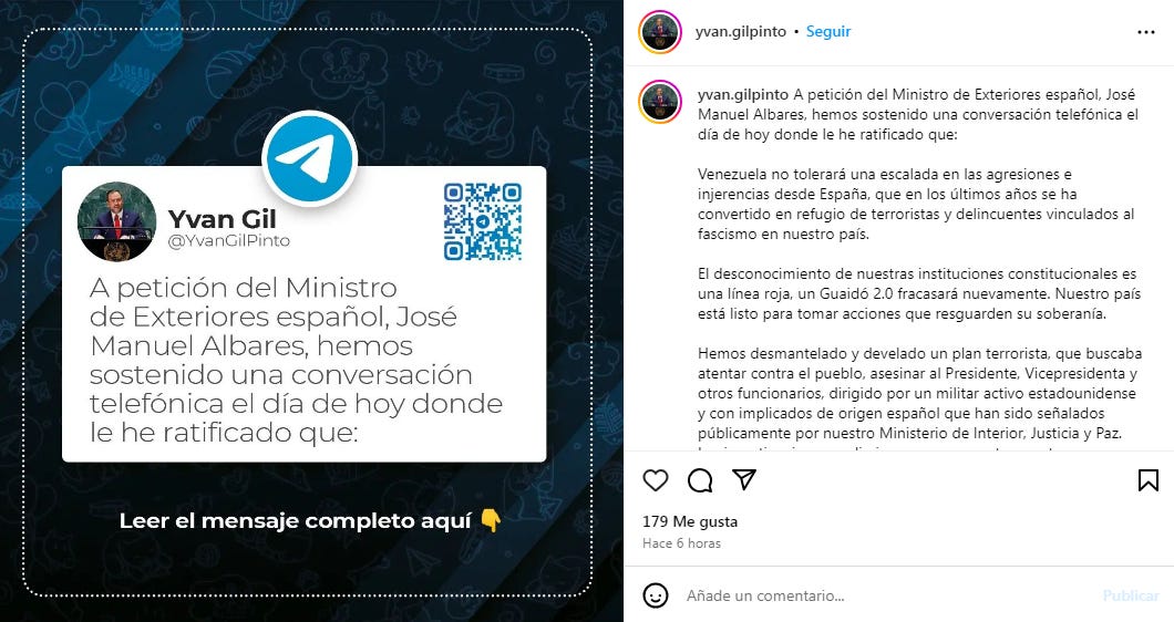Ayer el canciller Yván Gil habló por teléfono con el canciller español José Manuel Albares, que lo llamó para preguntar por los dos españoles presos por estar vinculados con el plan terrorista. Gil informó por redes sociales que se las cantó toditas y claritas: le dijo que “el desconocimiento de nuestras instituciones constitucionales es una línea roja”. Le explicó la investigación de la conspiración y la vinculación de los dos españoles que pertenecen a la unidad de inteligencia de su país. También le pidió que España “rectifique inmediatamente, condene el terrorismo sin ambigüedades y asuma los compromisos que le corresponden en el marco del derecho internacional.