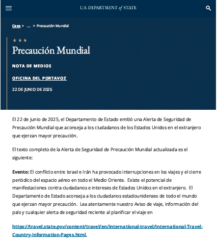 Mientras tanto, los gringos emitieron una alerta mundial para sus ciudadanos, para que “incrementen la precaución” ante posibles ataques de respuesta a la agresión que Washington cometió contra Irán.