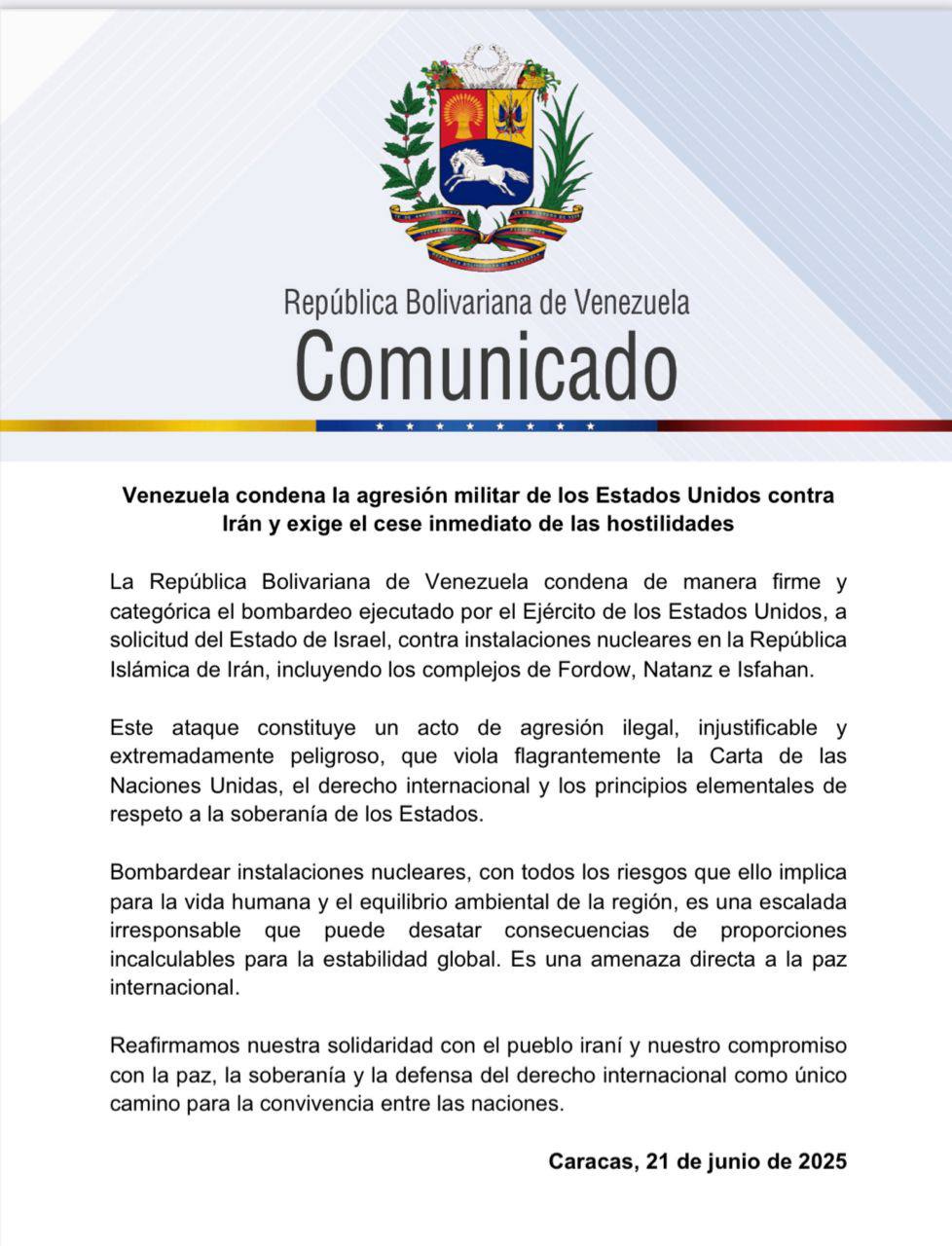 Ayer el presidente Nicolás Maduro condenó “de manera categórica y firme” el ataque que hizo el sábado Estados Unidos sobre territorio iraní. Señaló que fue “ una acción criminal que viola las normas del Derecho Internacional, la Carta de las Naciones Unidas” y que incluso ignora las leyes estadounidenses. Agregó que lo que sucedió pone en peligro la paz y la vida en el planeta.