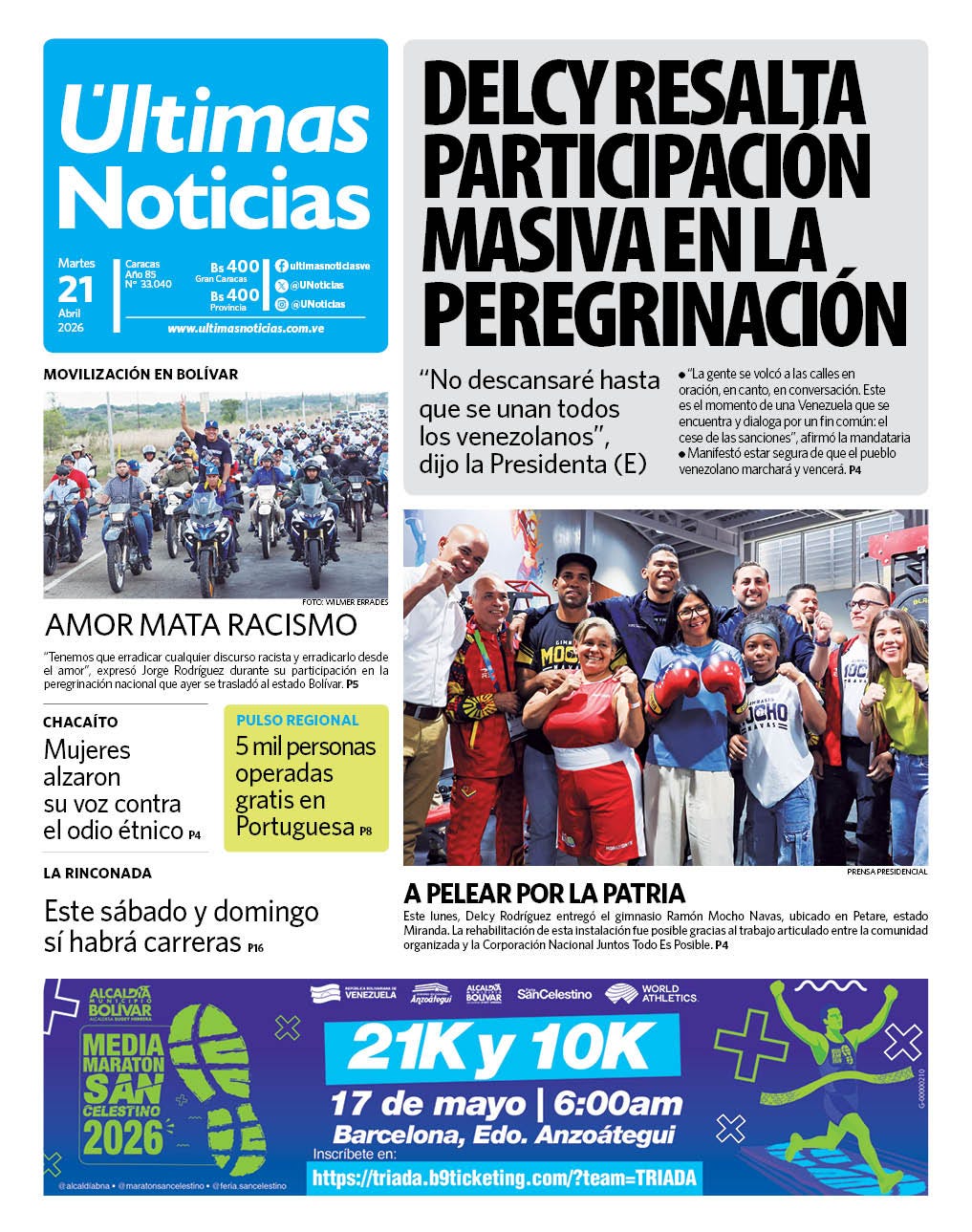 Así vamos, siempre pa’lante. Recuerda que para mantenerte al día, todo el día, lo único que tienes que hacer es conectarte con ultimasnoticias.com.ve, (@UNoticias) en X, TikTok, Threads, Facebook, Instagram, LinkedIn y también en nuestro canal de Telegram (@UNoticias). Te invito además a ¡leer el diario impreso! Busca ya tu ejemplar de Últimas Noticias.