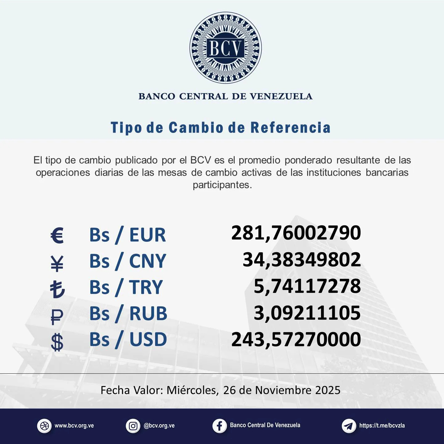 El Banco Central de Venezuela informó que las mesas de cambio de ayer arrojaron un promedio de 243,57 bolívares por dólar. Recuerda que esta es la única tasa válida para cualquier transacción del día de hoy.