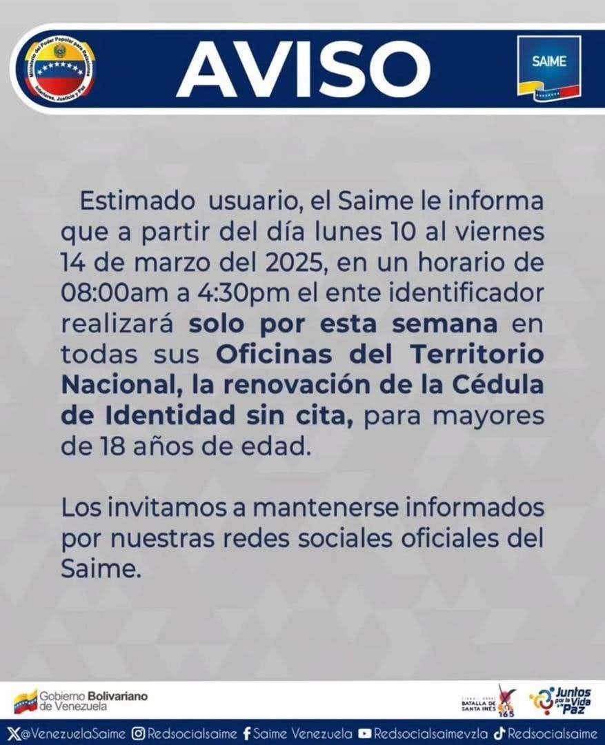 Esta semana, y “solo por esta semana”, el Saime estará sacando cédulas a adultos sin necesidad de hacer una cita por internet ni nada de eso. La cosa será así desde hoy y hasta el viernes en todas las oficinas del país.