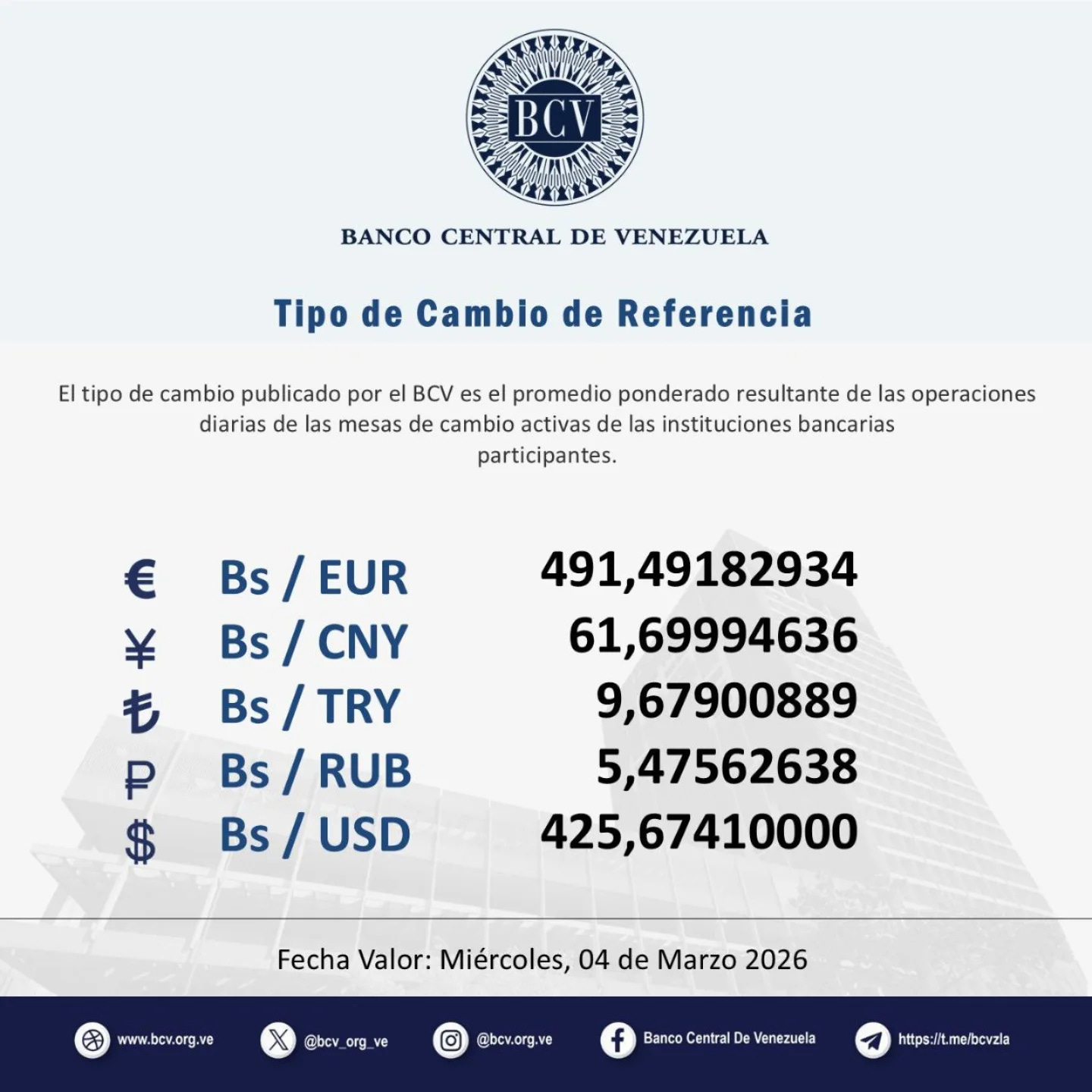 El Banco Central de Venezuela informó que las mesas de cambio de ayer arrojaron un promedio de 425,6741 bolívares por dólar. Recuerda que esta es la única tasa válida para cualquier transacción del día de hoy.