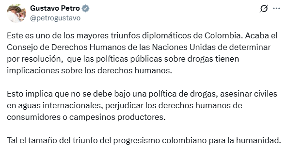 Y a propósito de lo que dice el gringo, precisamente ayer la Asamblea General de la ONU aprobó una resolución que, entre otras cosas, establece una relación entre las políticas antidrogas y los derechos humanos. Esta propuesta fue presentada por Colombia y otras 36 naciones. Gustavo Petro celebró la aprobación de la resolución explicando en X que es significa que un país, por más excusa de drogas que quiera meter, no puede estar asesinando civiles en el Caribe.