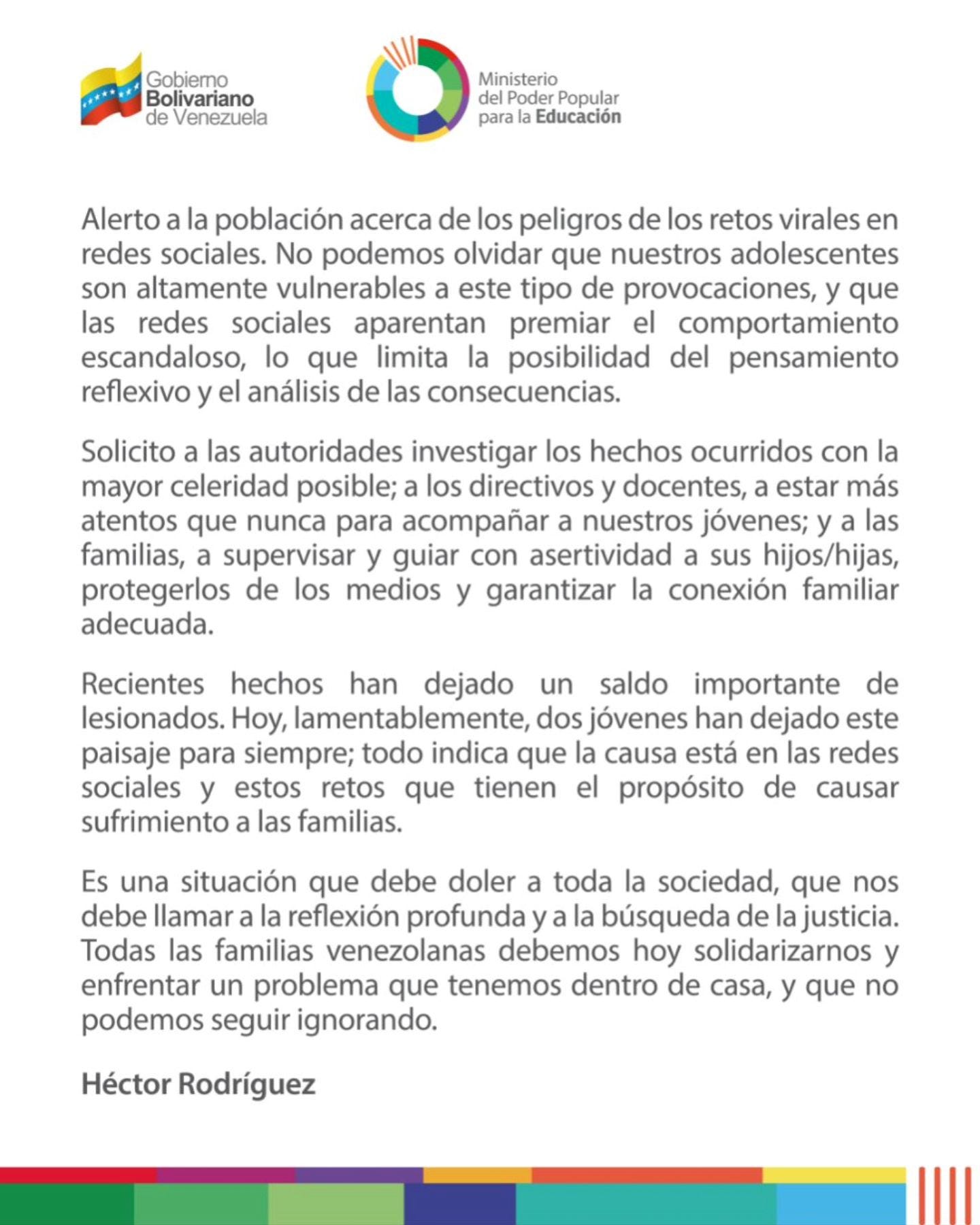 El ministro de Educación, Héctor Rodríguez, informó ayer las dos muertes y llamó a la reflexión desde la familia.