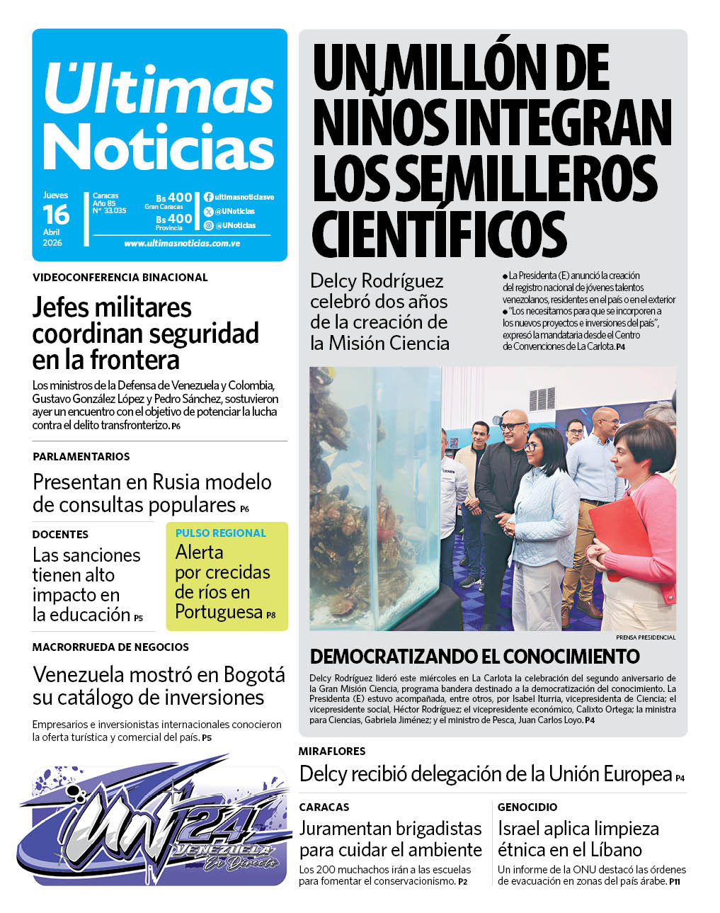 Ayer la presidenta encargada Delcy Rodríguez celebró el segundo aniversario de la Gran Misión Ciencia, Tecnología e Innovación Dr. Humberto Fernández-Morán y en el acto informó que el programa educativo Semilleros Científico ya cuenta un millón de niños alcanzados en el país. Recuerda que este programa consiste en talleres formativos prácticos en las escuelas en áreas como física, robótica y astronomía. El objetivo es atraer a niños y jóvenes hacia estas áreas para formar a la próxima generación de científicos.