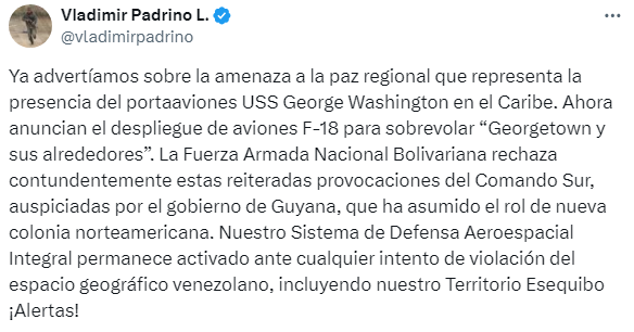 Mosca con esto: el general Vladimir Padrino López respondió al anuncio de los gringos de que un portaaviones (el portaaviones USS George Washington) hace presencia en el Caribe, cerca de Venezuela, y desde allí activarían un sobrevuelo de aviones F-18 sobre la ciudad de Georgetown (capital de Guyana) y sus alrededores. Padrino dijo que el Sistema de Defensa Aeroespacial de la FANB permanece activado para neutralizar cualquier intento de violación de nuestro espacio geográfico, incluyendo la Guayana Esequiba.