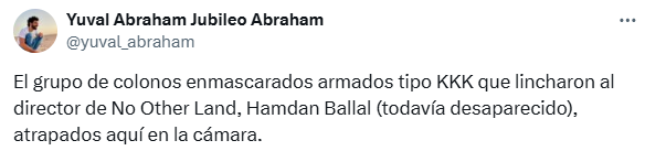 Otro de los directores de la película, el hebreo Yuval Abraham, informó en X que después de que los fascistas le cayeran agolpes, y estando herido y sangrando en una ambulancia que habían llamado, llegó el ejército sionista y se lo llevó secuestrado.