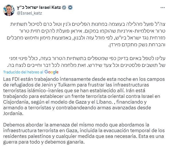 Este sujeto habla, como si fuera cualquier cosa, que pretenden hacer una “evacuación” de los “residentes palestinos”, o sea anuncian que van a aplicar la misma estrategia genocida que implementan en Gaza, obligando a la gente a salir de sus territorios, al tiempo que ejecutan ataques brutales, asesinando a miles de personas.